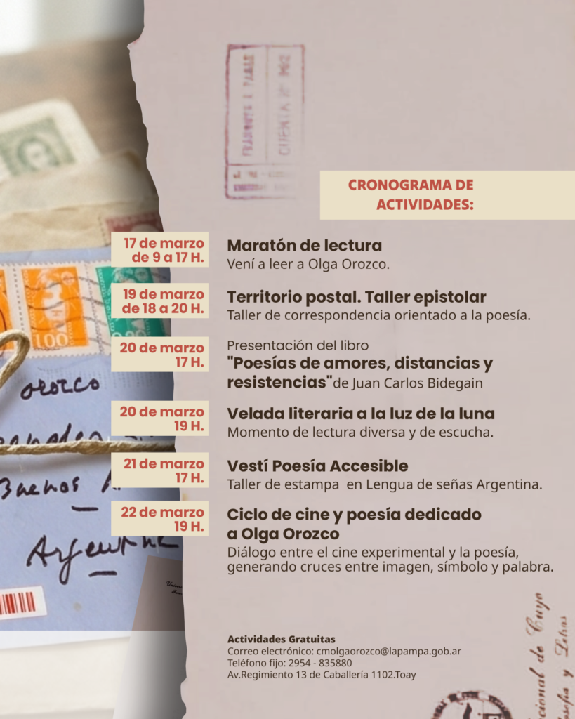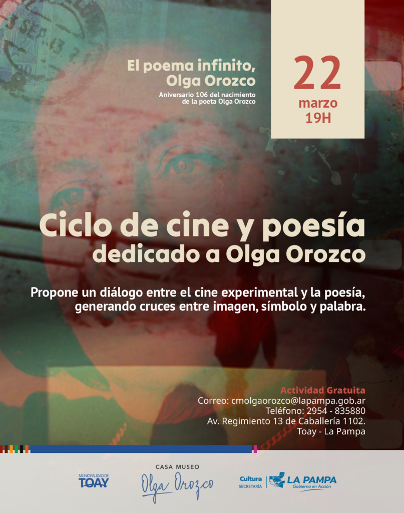 Bajo el lema “El poema infinito, Olga Orozco”, la institución, dependiente de la Secretaría de Cultura de La Pampa y la Municipalidad de Toay, invita a la comunidad a participar de maratones de lectura, talleres de escritura, presentaciones de libros y un ciclo de cine experimental.