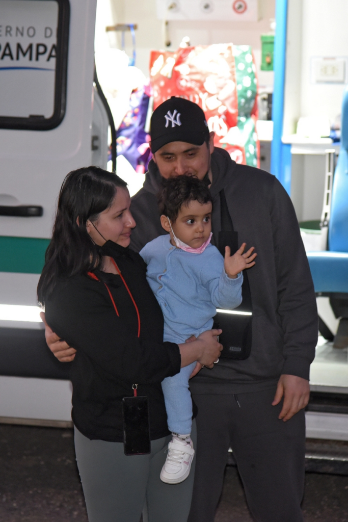 El avión sanitario del Gobierno provincial arribó al aeropuerto de Santa Rosa a las 19. Desde hacía dos horas, su familia esperaba la llegada de la familia compuesta por Ambar, su mamá Shaira Rivero y su papá Maximiliano Suárez. El vuelo llegó con retraso y el frío llegó, pero la familia no se movió del lugar. Llevaron globos rosas y carteles con distintas inscripciones dándole la bienvenida a la niña de dos años y 10 meses.